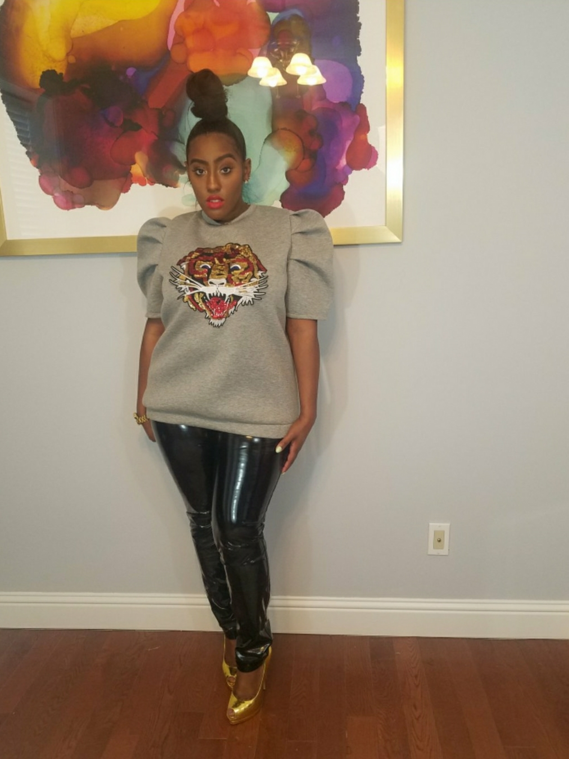 Heathered grey sweatshirt. Scoopneck. Dramatic, puffy shoulders. Lioness applique.